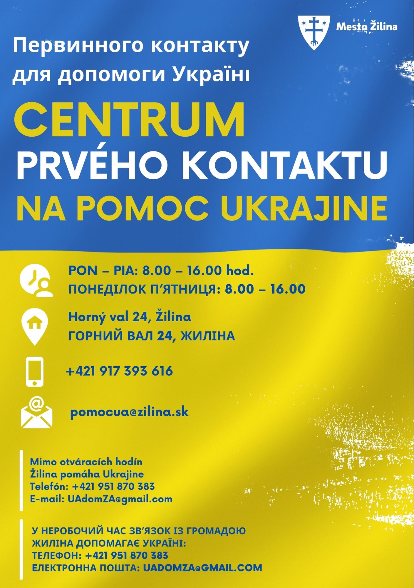 Hľadáme dobrovoľníkov do Centra prvého kontaktu na pomoc Ukrajine na ul. Horný val 24 v Žiline na komunikáciu s ľuďmi, ktorí do centra prichádzajú v čase od 08.00 h do 16.00 h. Vhodnými osobami sú dôchodcovia prípadne študenti, ktorí sú k dispozícii na prácu v uvedených časoch. Podmienkou je plynulá znalosť ruského jazyka / ukrajinského jazyka. Nástup IHNEĎ od pondelka 14.3.2022. Záujemci (možná aj dovp) prosíme nahlasovať emailom: Táto e-mailová adresa je chránená pred spamovacími robotmi. Na jej zobrazenie potrebujete mať nainštalovaný JavaScript., osobne na Obecnom úrade, prípadne tlf.: 0415695138