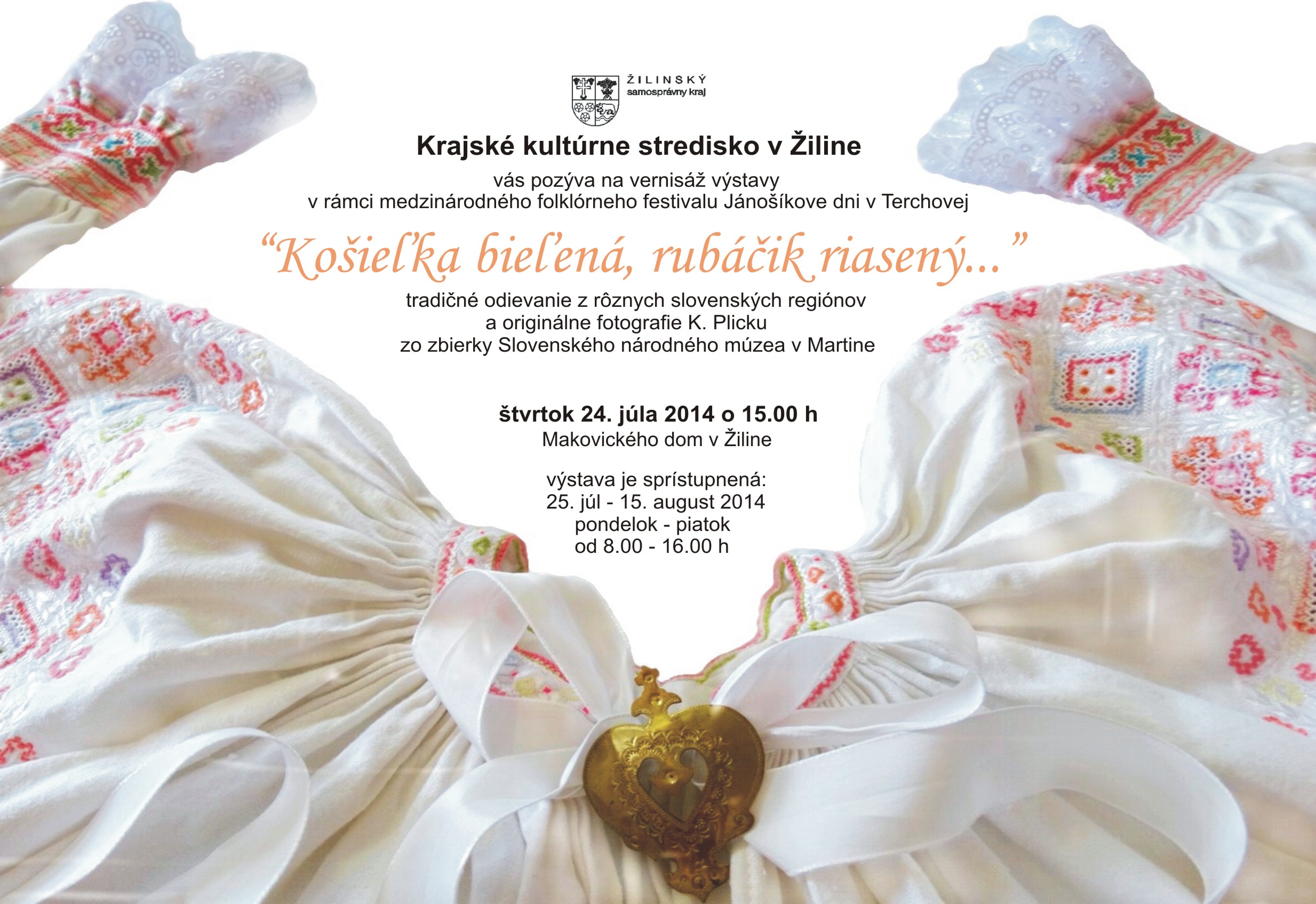 Krajské kultúrne stredisko v Žiline v zriaďovateľskej pôsobnosti Žilinského samosprávneho kraja pozýva širokú verejnosť na vernisáž výstavy „Košieľka bieľená, rubáčik riasený...“, ktorá sa uskutoční 24. júla 2014 o 15. h v Makovického dome v Žiline. Výstava je živou pozvánkou na 52. ročník medzinárodného folklórneho festivalu Jánošíkove dni v Terchovej. Návštevníci uvidia ľudové odevy z 30 obcí Slovenska doplnené krojovanými bábikami a originálnymi fotografiami Karola Plicku zo zbierky Slovenského národného múzea v Martine. Na malom priestore sú sústredené sviatočné či svadobné kroje, ale i odev, ktorý si obliekal ľud v bežný pracovný deň. Výstava ulahodí oku nielen fanúšikom a milovníkom folklóru, ale určite aj všetkým návštevníkom Makovického domu v Žiline.