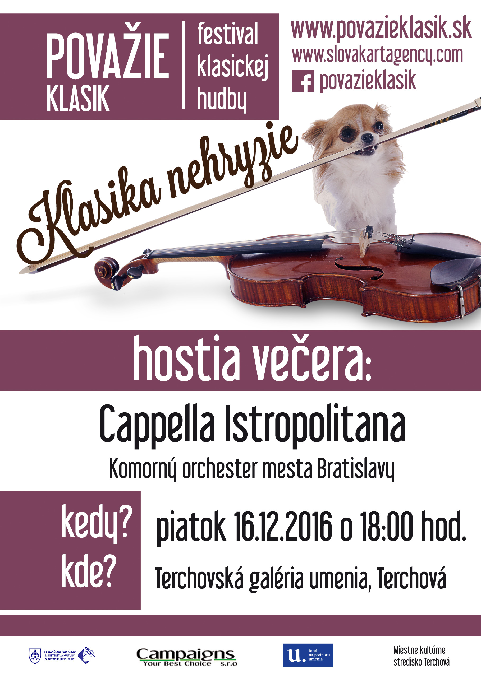 Pozývame vás na koncert s názvom Klasika nehryzie, ktorý sa uskutoční v piatok 16. decembra 2016 o 18:00 hod. v Terchovskej galérii umenia. Hosiťami večera bude Cappella Istropolitana Komorný orchester mesta Bratislavy.