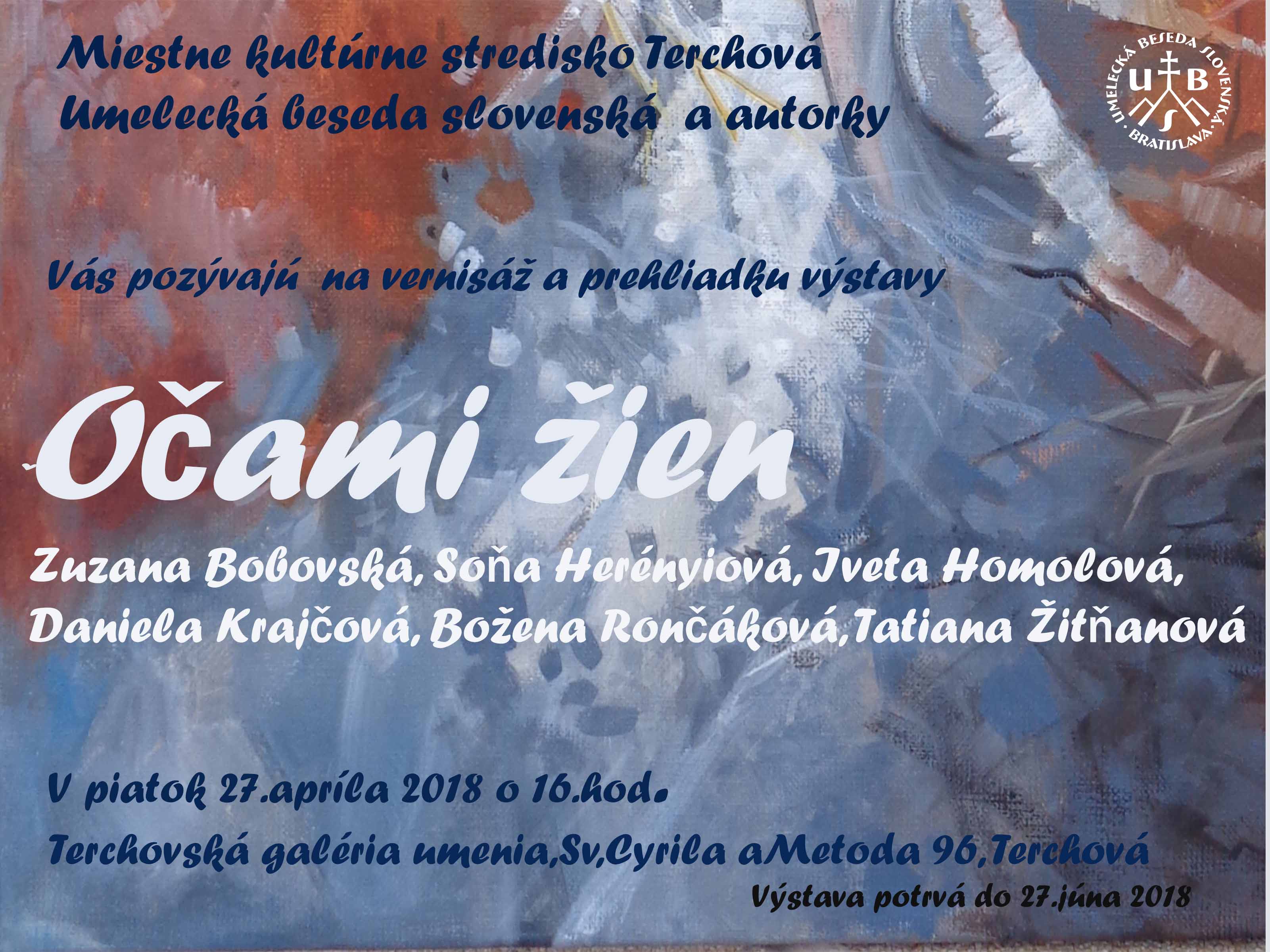 Miestne kultúrne stredisko Terchová, Umelecká beseda slovenská a autorky, vás pozývajú na vernisáž a prehliadku výstavy s nýzvom Očami žien, ktorá sa uskutoční v piatok, 27. apríla 2018 o 16:00 hod v Terchovskej galérii umenia (Sv. Cyrila a Metoda 96, Terchová). Výstava potrvá do 27. júna 2018.