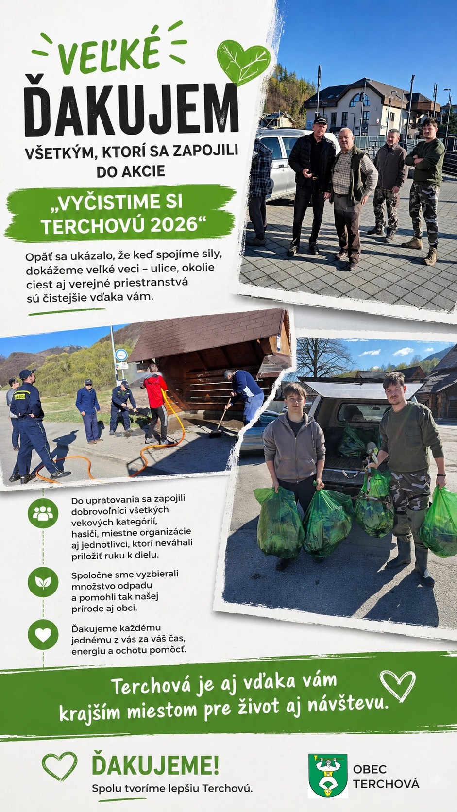 Jozef Dávidík, starosta obce, úprimne ďakuje všetkým členom Dobrovoľného hasičského zboru, Poľovných združení Jánošík, Terchová, Vrátna, Rybárom a všetkým ostatným čo sa pridali k vyčisteniu našej Terchovej 18.04.2026.